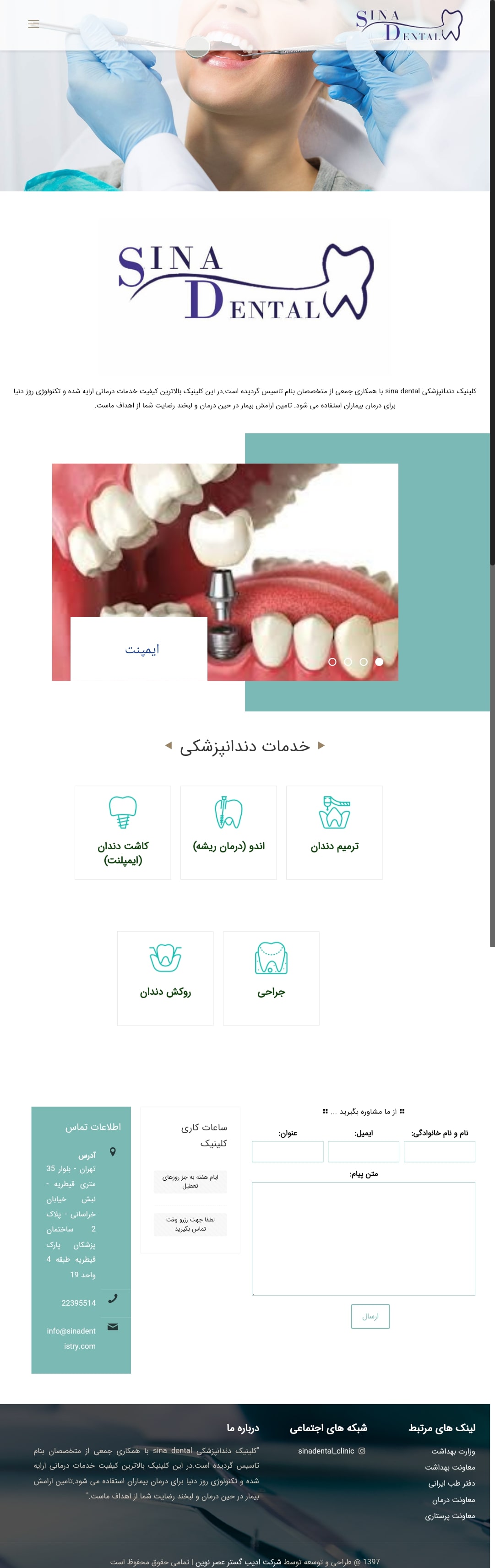 کلینیک دندانپزشکی sina dental با همکاری جمعی از متخصصان بنام تاسیس گردیده است.در این کلینیک بالاترین کیفیت خدمات درمانی ارائه شده و تکنولوژی روز دنیا برای درمان بیماران استفاده می شود.تامین ارامش بیمار در حین درمان و لبخند رضایت شما از اهداف ماست